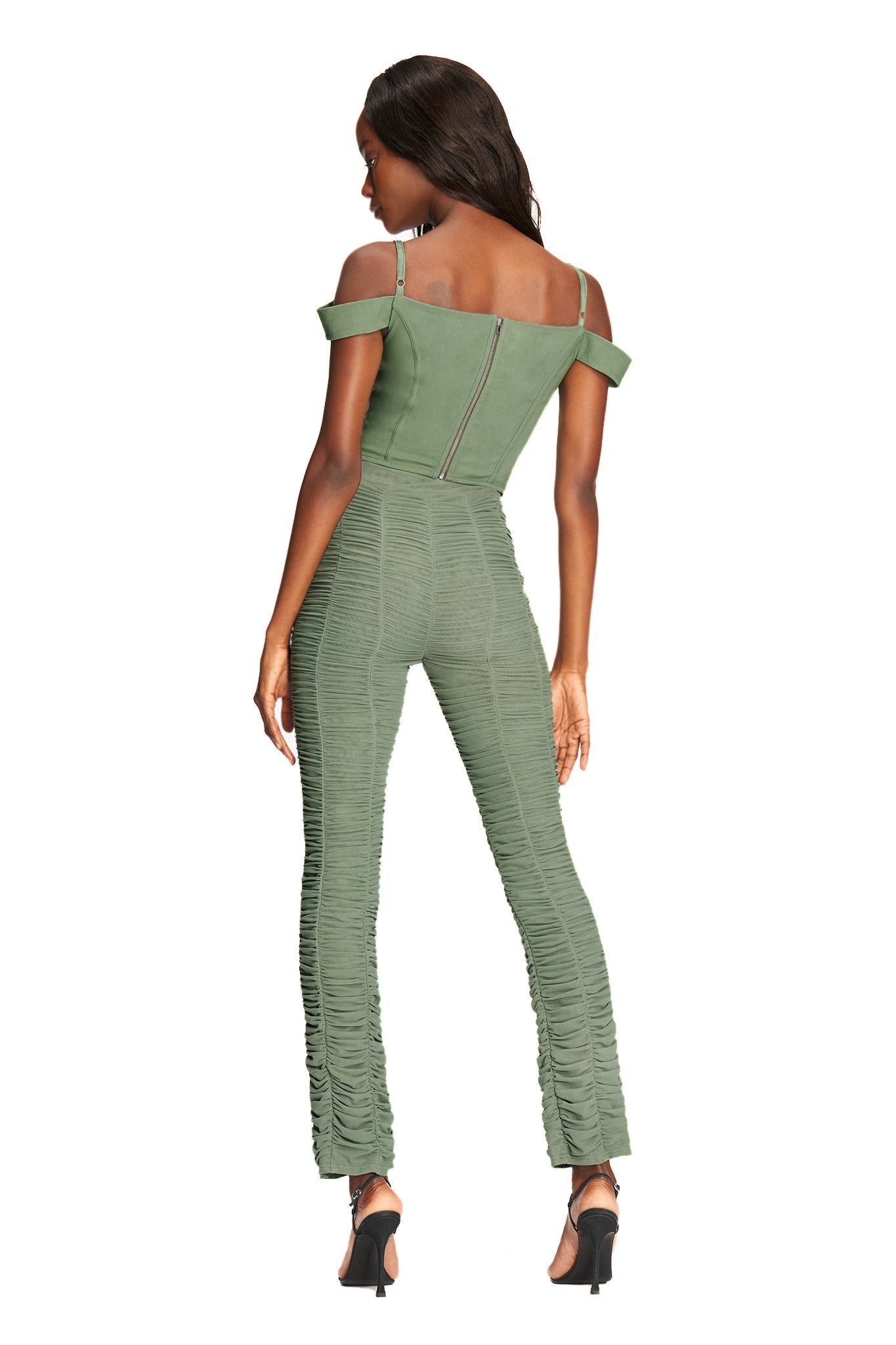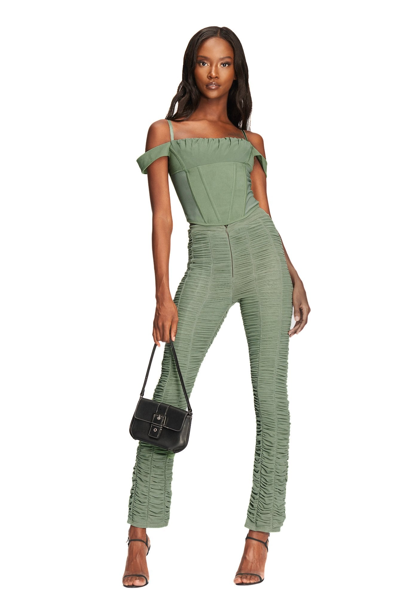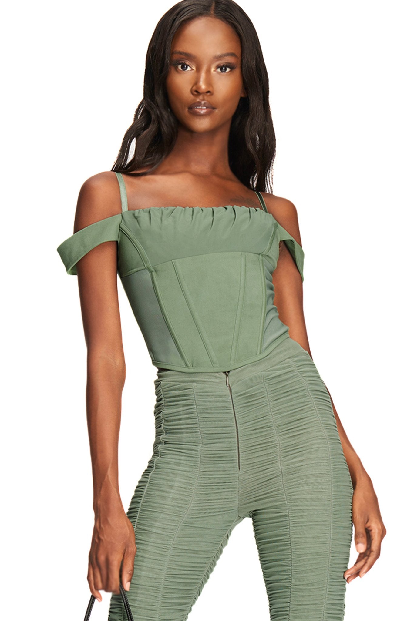 Khaki corset top with off-shoulder sleeve