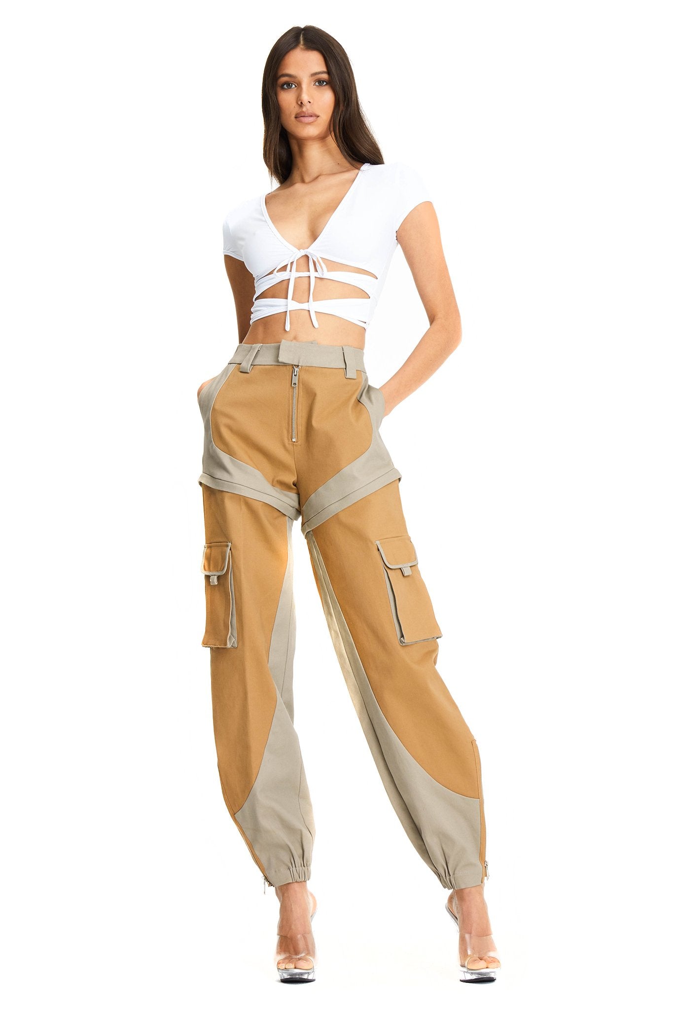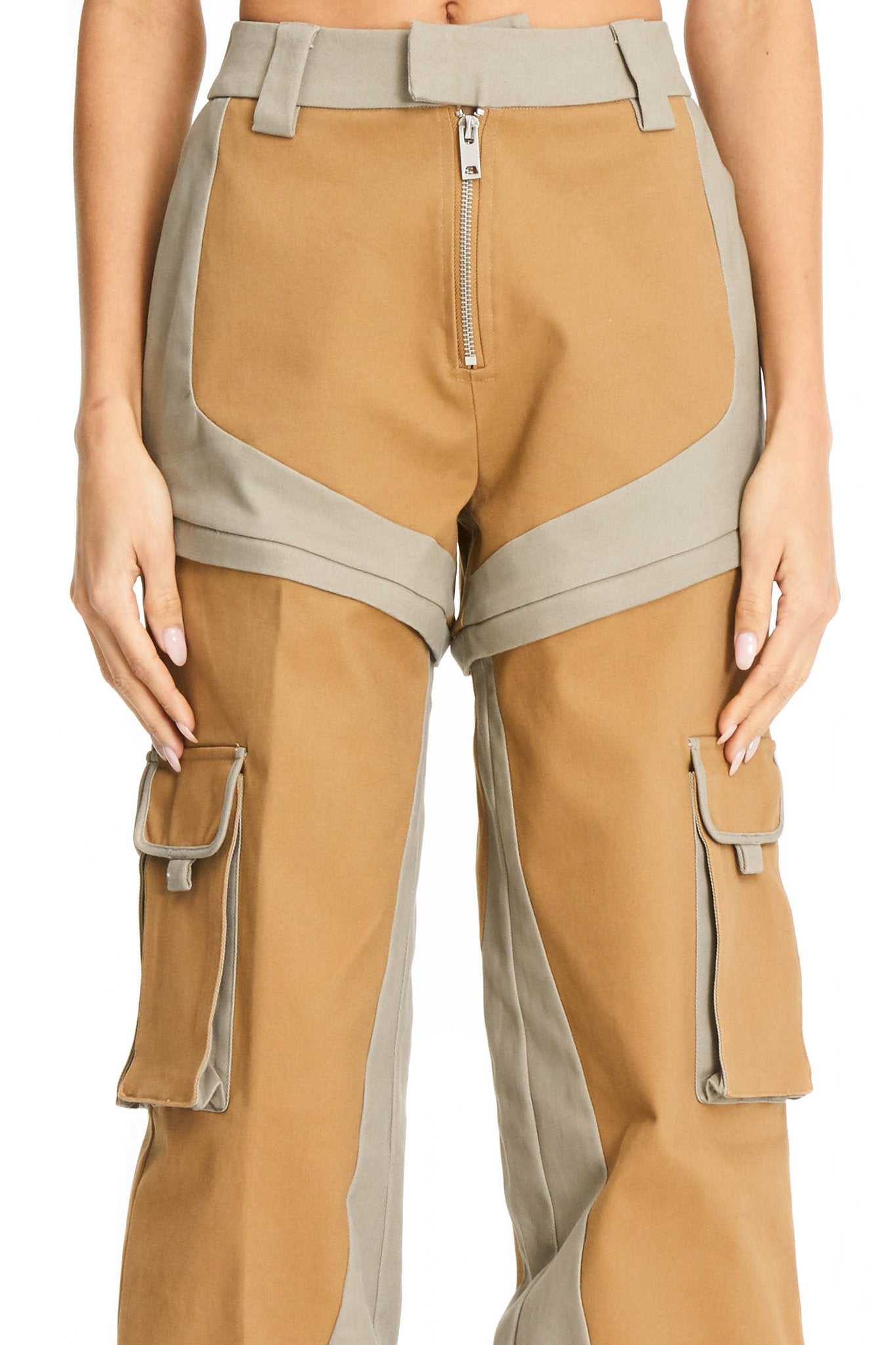 Tan and grey cargo pantsRemovable leg to convert to shortsFront metal zip detailElastic ankle cuffsBelt loop holesLarge cargo pockets on side